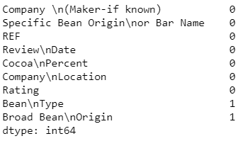 # Let's have a look how many values are missing.chocolate_data.isnull().sum()
