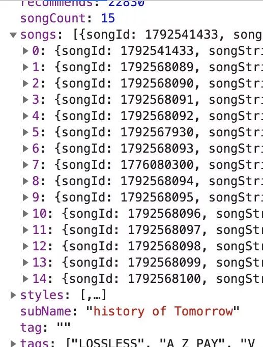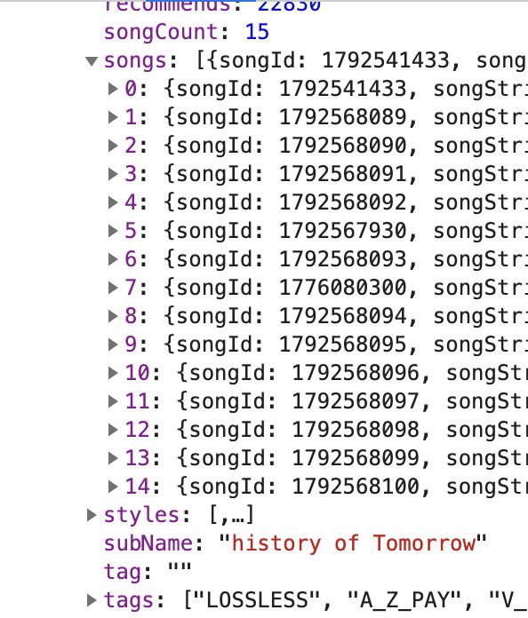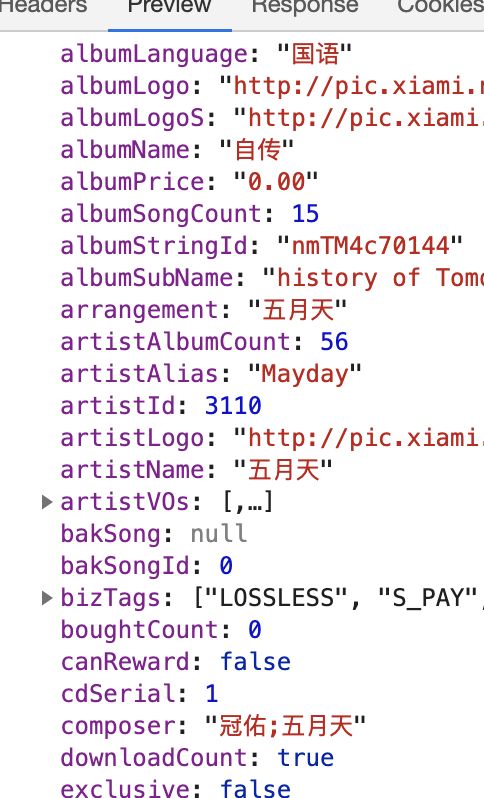 所以我以“五月天-艺人-专辑信息-歌曲id-歌曲详情”这个路径进行数据爬取。我发现,无论是专辑信息、歌曲list还是歌曲详情,都存在于非常漂亮的JSON格式里面:
