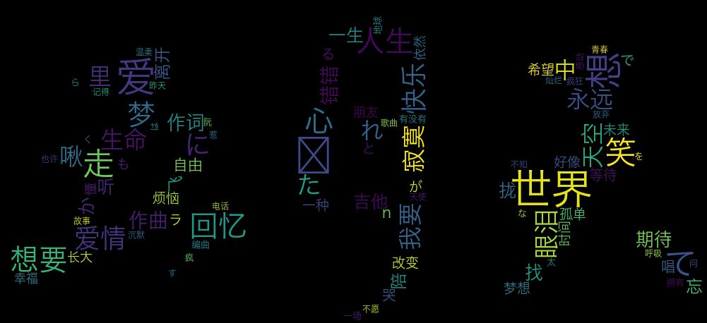 为歌词做个词云,我发现了五月天为什么总是吸引大批五好青年的原因:胸怀“世界”,心中充满”爱“,敢“想”敢“笑”,不惧“人生”和“回忆”,勇敢怀揣着“梦”想。试问谁听了这些歌曲还能安然地继续做“咸鱼”呢?