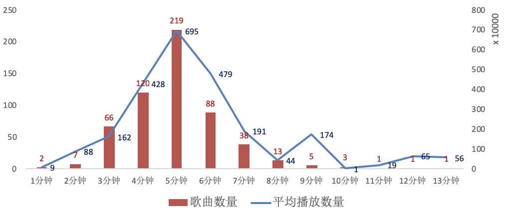 神奇的是,平均每首歌的播放数量也是如此的趋势:时长为5分钟的歌曲平均每首歌播放次数有219w+。所以呀,写歌还是写5分钟多的,也许这样更容易火呢~