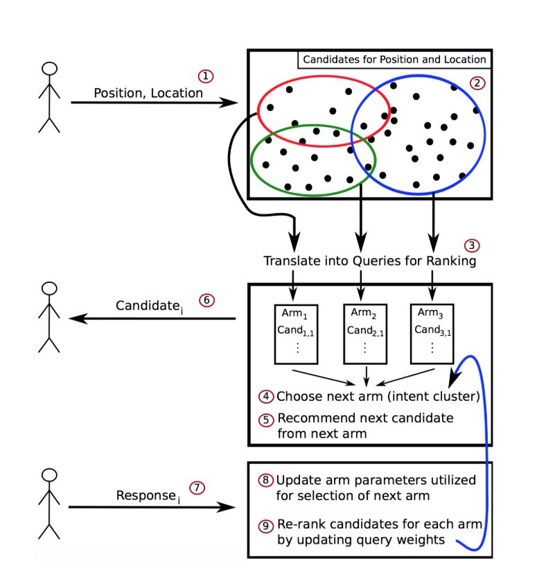 LinkedIn招聘官所要求的另一种个性化体验是在当前搜索环节里的体验升级。利用离线学习模型的一个缺点是,当招聘人员审查推荐的候选人并提供反馈时,这些反馈是不会被采用到当前搜索环节里的。为了解决这个问题,LinkedIn Recruiter使用了一种被称为“多武器强盗模型”的技术来改进不同候选人群体的推荐。体系结构首先将工作的潜在候选人划分为技能组。然后,利用一个多武器强盗模型,根据招聘人员当前的意图来了解哪一组更适合,并根据反馈更新每个技能组中的候选人排名。