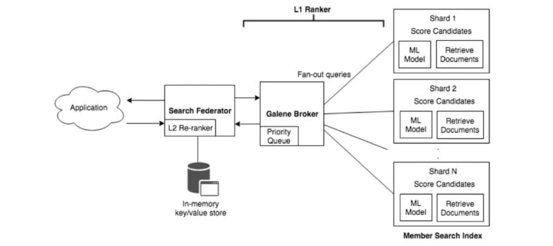 在该体系结构中,Galene代理系统将搜索查询请求分散到多个搜索索引分区。每个分区检索匹配的文档,并将机器学习模型应用于检索到的候选文档。每个分区对候选项的子集进行排序,然后代理收集排序后的候选项并将它们返回给联邦服务器。连接使用附加的排序功能对检索到的候选项进行进一步排序,并将结果交付给应用程序。