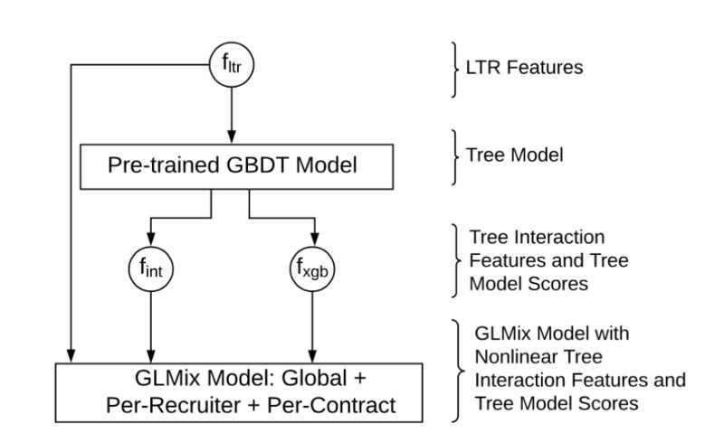 具体来说,LinkedIn的招聘人员使用了一种架构,它结合了学习排名功能、树交互功能和GBDT模型评分。将学习到等级的特征作为预先训练的GBDT模型的输入,该模型生成编码为树交互特征的树集合和每个数据点的GBDT模型得分。然后,利用原始的学习排序特性及其以树交互特性和GBDT模型评分形式的非线性转换,广义线性模型可以实现招聘级和合同级的个性化。