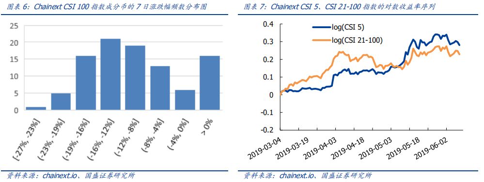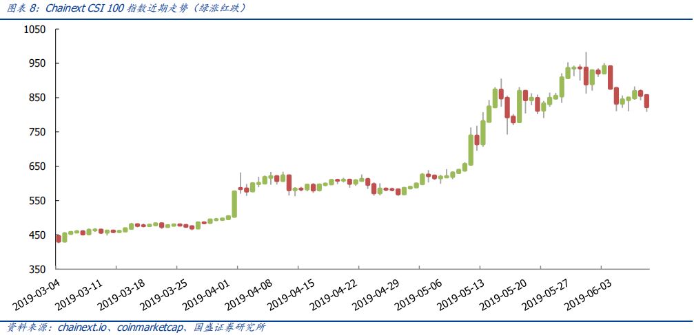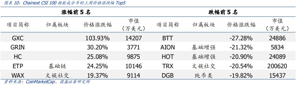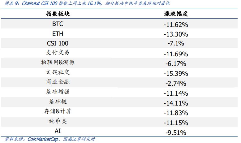 上周行情回顾:Chainext CSI 100下降12.5%,细分板块中商业金融表现最优。从细分板块来看,商业金融、物联网&溯源表现优于Chainext CSI 100平均水平,分别为-2.74%、-6.17%,AI、基础增强、纯币类、支付交易、存储&计算、基础链、文娱社交板块表现逊于Chainext CSI 100平均水平,分别为9.51%、-11.14%、-11.15%、-11.69%、-11.83%、 -14.11%、-15.39%。