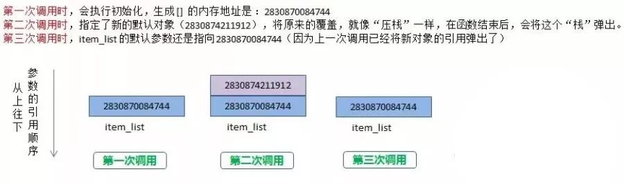 对于参数中提供了初始值的参数,由于 Python 中的函数参数传递的是对象,也可以认为是传地址,在第一次初始化 def 的时候,会先生成这个可变对象的内存地址,然后将这个默认参数 item_list 会与这个内存地址绑定。在后面的函数调用中,如果调用方指定了新的默认值,就会将原来的默认值覆盖。如果调用方没有指定新的默认值,那就会使用原来的默认值。