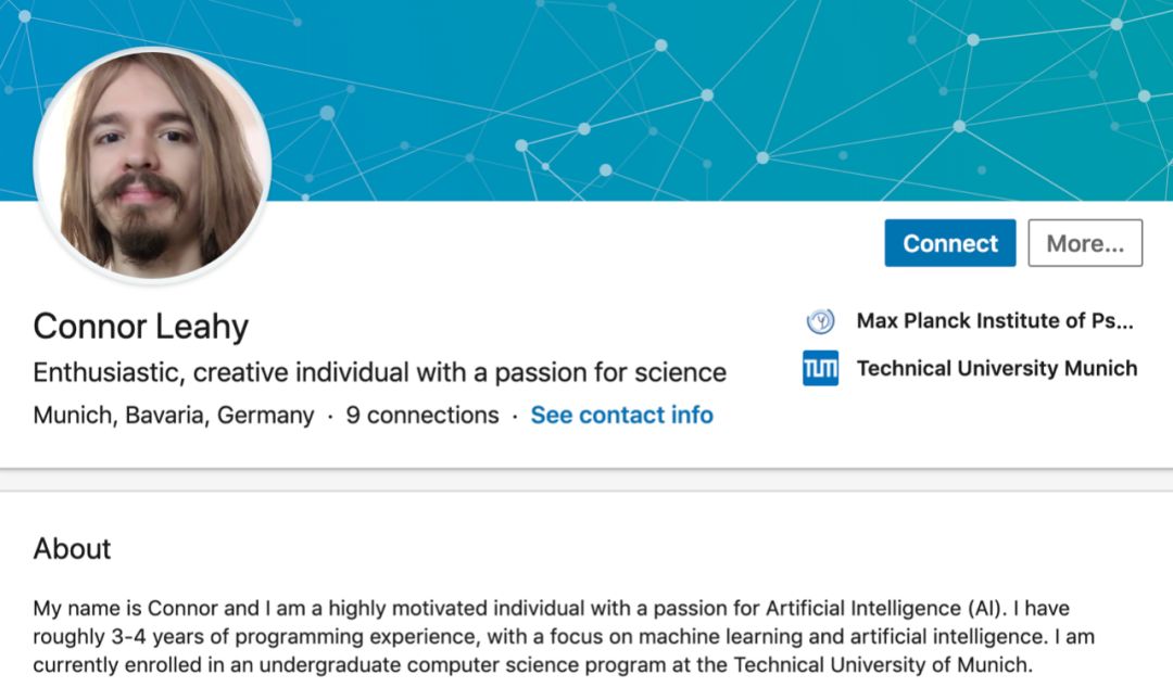 Connor Leahy同学2017年考入德国慕尼黑工业大学,目前是一名大三的计算机本科学生。在LinkedIn上,他说自己对人工智能充满热情。