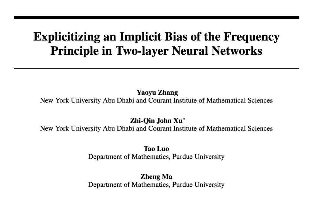 Zhang, Y., Xu, Z.-Q. J.*, Luo, T. & Ma, Z. (2019a), ‘Explicitizing an Implicit Bias of the Frequency Principle in Two-layer Neural Networks’, arXiv:1905.10264 [cs, stat]. arXiv: 1905.10264.