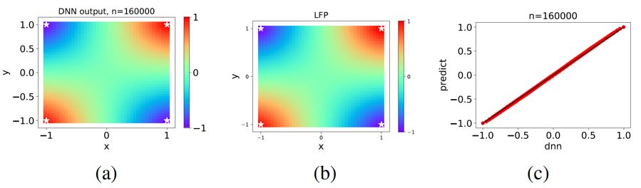 对于二维情形(d=2),我们用一个著名的 XOR 问题来检验 LFP 模型的有效性。训练数据集有四个样本点,由白色星号标记出来。训练结束后,DNN 输出函数构成了这四个点在二维区域 [-1,1]×[-1,1] 上的一个连续的插值函数(左图)。中图是 LFP 模型预测的插值函数,与左图非常相似。两者之间定量的比较如右图所示。容易看出,两者在所有测试点(1600 个均匀分布的网格点)上的值几乎一致。