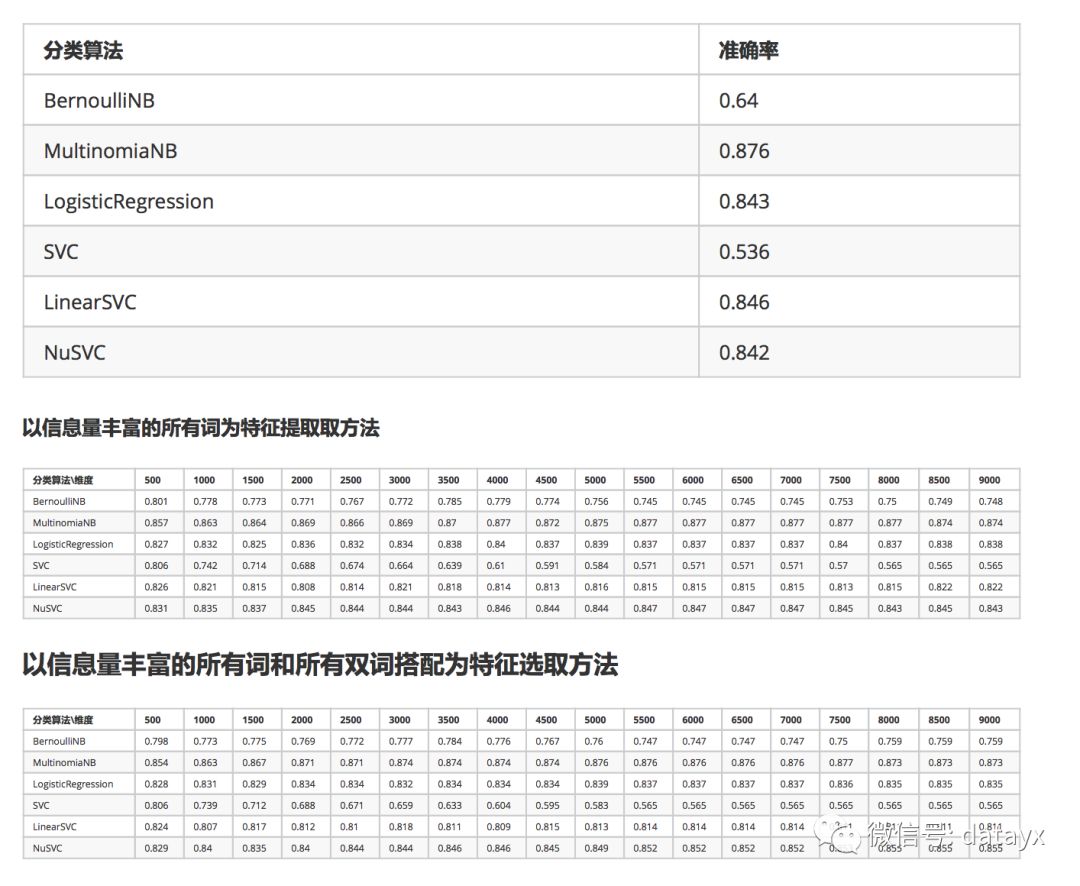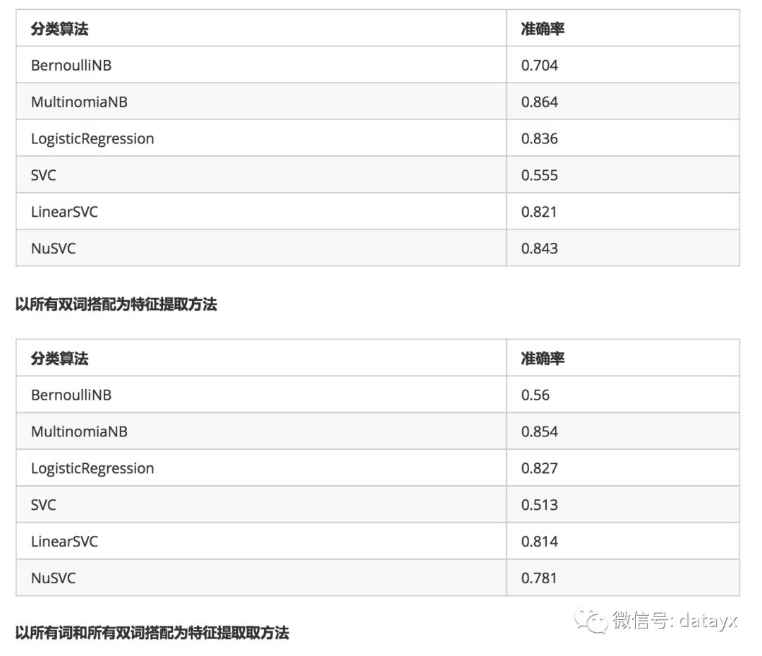 最后选择准确度最高的方案,将上述带有正向标签和负向标签的各2000条真实的中文酒店评论语料作为训练集训 练最终存储的分类器。