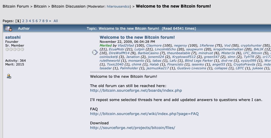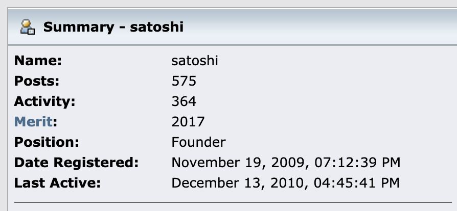 2009年11月22日,中本聪创建了论坛Bitcointalk,使用'satoshi'作为他的用户名。他把主要阵地从之前的 Sourceforge 论坛中转移到了 Bitcointalk。