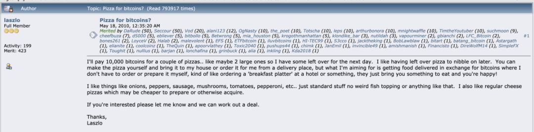 随着社区的发展,拉斯洛·汉耶茨(Laszlo Hanyecz)首次将比特币用于商业交易,他设法用1万比特币买了两个约翰爸爸牌披萨(Papa John’s pizza)。