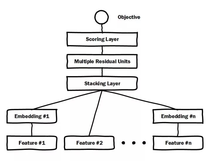 微软于2016年提出的Deep Crossing可以说是深度学习CTR模型的最典型和基础性的模型。如图2的模型结构图所示,它涵盖了深度CTR模型最典型的要素,即通过加入embedding层将稀疏特征转化为低维稠密特征,用stacking layer,或者叫做concat layer将分段的特征向量连接起来,再通过多层神经网络完成特征的组合、转换,最终用scoring layer完成CTR的计算。跟经典DNN有所不同的是,Deep crossing采用的multilayer perceptron是由残差网络组成的,这无疑得益于MSRA著名研究员何恺明提出的著名的152层ResNet。