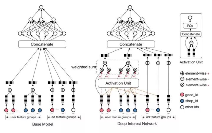 图10 阿里DIN模型与Base模型的架构图