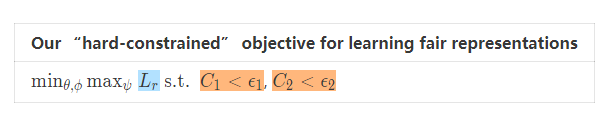 现在让我们仔细观察「软正则化」损失函数,可以明显发现现有的学习公平表示的方法会产生有用性和公平性兼具的表示,表现力和公平性之间的平衡由 λs 的选择所控制。如果我们能优化我们的「硬约束」目标,那么有关方就可以通过设置 ϵ,来对不公平性进行具体限制。