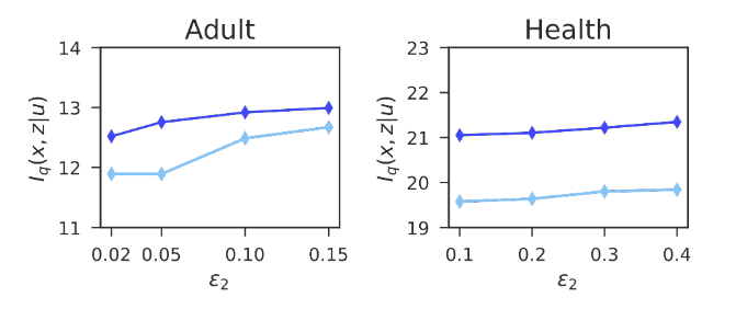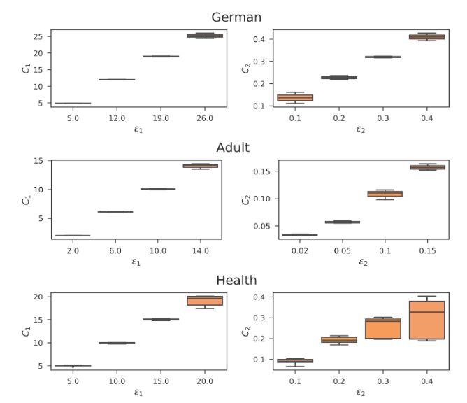 不出所料,我们的结果证实在所有三组学习公平表示中,有关方对 ϵ1 和ϵ2 的选择,控制了不公平的近似值 C1 和 C2。