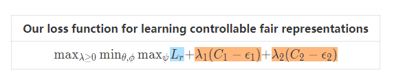 直观而言该损失函数意味着,每当我们考虑由于 C1>ϵ1 或 C2>ϵ2 导致的不公平时,λs 将额外强调未满足的约束;这种额外的强调将一直持续到 C1 和 C2 满足有关方设定的限制为止。而当 C1 和 C2 在安全在限制范围内时,将优先考虑最小化 Lr ,进而有利于产生富有表现力的表示。