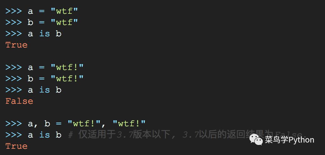 字符串中只包含字母,数字或下划线时将会驻留. 所以 'wtf!' 由于包含 ! 而未被驻留. 可以在这里找到 CPython 对此规则的实现.