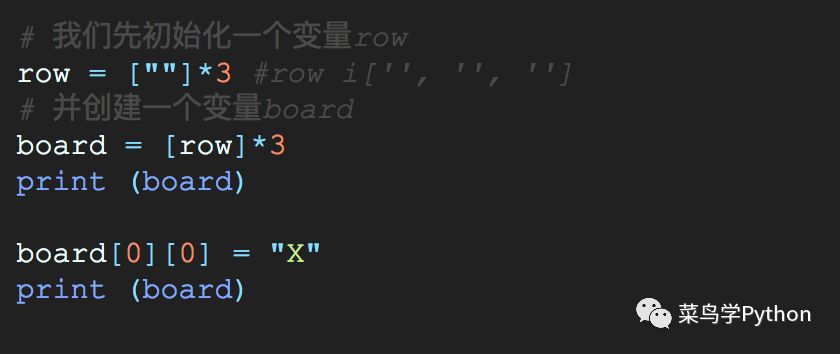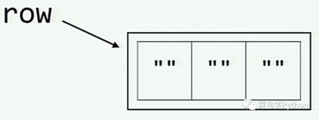 而当通过对 row 做乘法来初始化 board 时, 内存中的情况则如下图所示 (每个元素 board[0], board[1] 和 board[2] 都和 row 一样引用了同一列表.)