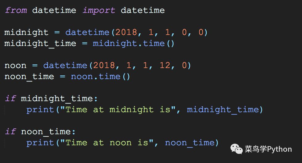 midnight_time 并没有被输出.在Python 3.5之前, 如果 datetime.time 对象存储的UTC的午夜时间(译: 就是 00:00), 那么它的布尔值会被认为是 False. 当使用 if obj: 语句来检查 obj 是否为 null 或者某些“空”值的时候, 很容易出错.