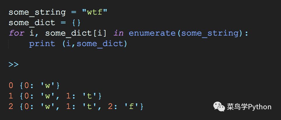 没错输出的是:{0: 'w', 1: 't', 2: 'f'}。 咋看一下确实很奇怪啊,我们来慢动作看一下: