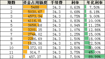 这个问题的核心就是:资金占用成本随着每期逐级递减(因为每期还款),而手续费却是不变的,这就导致了每一期的年化逐级递增。这样看来只有第一期的年化是7.5%,其它期都是高于7.5%的。那么按照这个还款金额,真正的年化应该是多少呢?