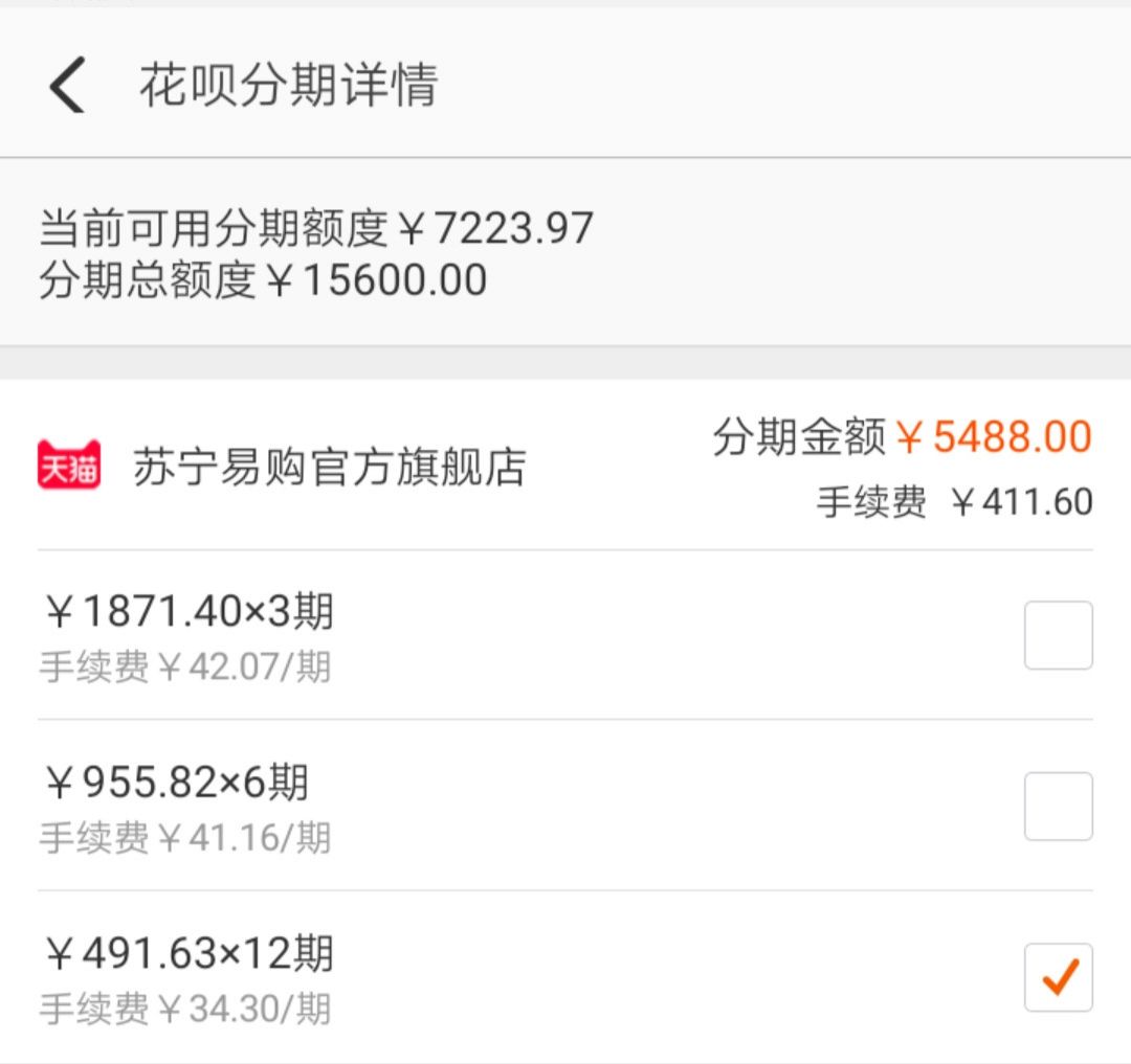 我们点进去看一下花呗分期的情况,12期手续费一共411.6元,也就是每一期需要还本息491.63元,利息34.3元。