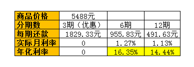 卖家搞活动,因此3期手续费为零。6期年化高达16.35%,如果按照错误逻辑算才4.5%,这差距我不说也看出来了。