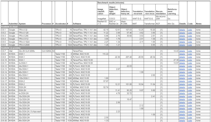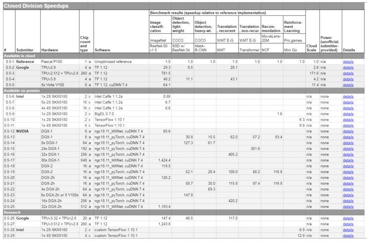 通过这次竞赛,MLPerf 产生了封闭专区 V0.5 版本,其结果如下: