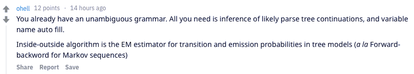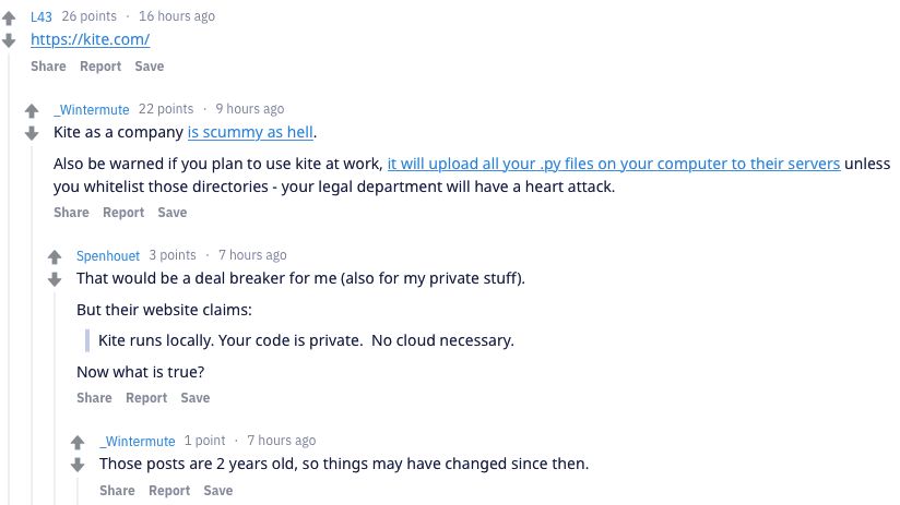 在讨论中,有人提出,一些无良的自动补全工具会悄悄上传代码到他们的服务器中,(而自行训练的深度学习模型不存在这个问题)。
