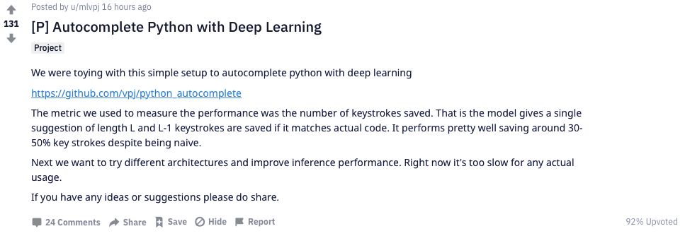 「我们已经有很多很好用的自动补全工具了,比如 kite(一个可以在 IDE 上使用的插件),为什么还要费心搞个机器学习模型?」