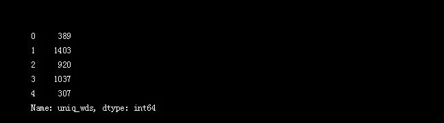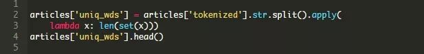 对前面创建的tokenized的列中的系列进行操作,我们将从 string库调用 split函数。然后我们将从我们的系列中获取集合以消除重复的单词,然后使用len()测量集合的大小。