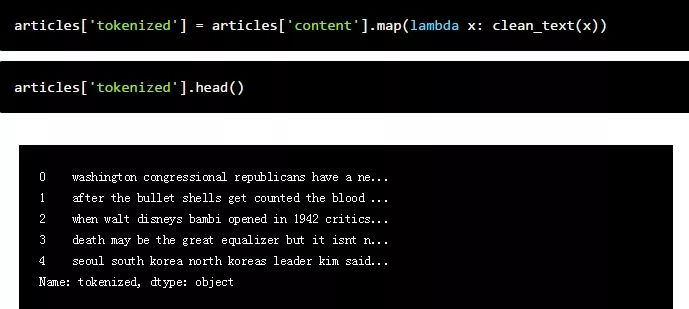 现在,我们将在我dataframe中创建一个新列,其中包含已清洗的文本。