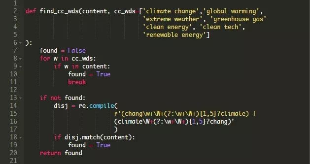 我们如何判断一篇文章是否在谈论气候变化?有几种方法可以做到这一点。我们可以使用高级文本分析技术(如集群或主题建模)来识别概念。但是对于本文的目的来说,我们保持简单一些:让我们只识别可能与主题相关的关键字,并在文章中搜索它们。只要头脑风暴一些有趣的单词和短语就可以了。