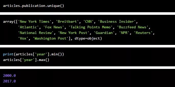 接下来,我们将确保拥有与原始数据集中相同的发布名称,并检查最早年份和最新年份的文章。