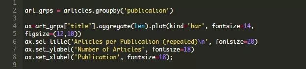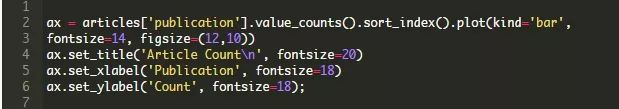 在本例中,这个列就是publication。第一个图表通过对len进行合计只使用每个组中的对象数量。我们可以在下面的代码中使用除title之外的任何其他列。