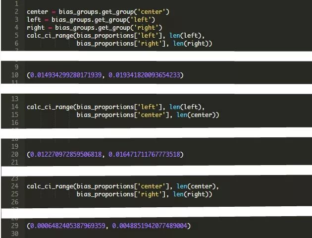 从上面的图表中可以明显看出,不同的政治倾向分组中气候变化相关文章所占的比例是不同的,但是让我们来正式检验一下我们的假设。为此,对于给定的一对文章分组,我们先提出零假设,即假设与气候相关的文章的总体比例没有差异。我们也为我们的校验建立一个95%的置信水平。