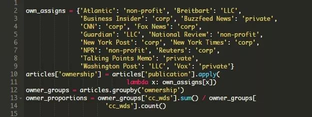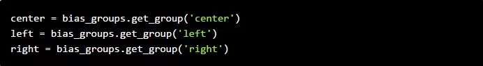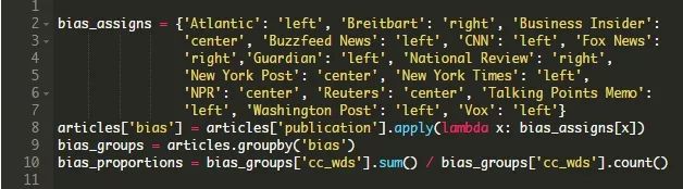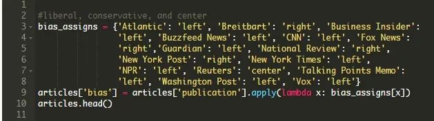 让我们从政治倾向开始。你可以重新浏览这篇文章的顶部来提醒自己我们是如何收集有关媒体的政治倾向的信息的。下面的代码使用一个字典来根据收集到的信息为每个发布名称分配left、right和center值。