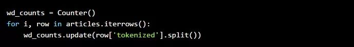 我们将使用一个Python Counter,这是一种特殊的字典,它假定每个键的值为整数类型。在这里,我们将使用文章的标记化版本来遍历所有文章。