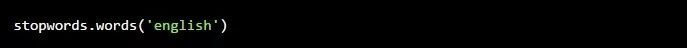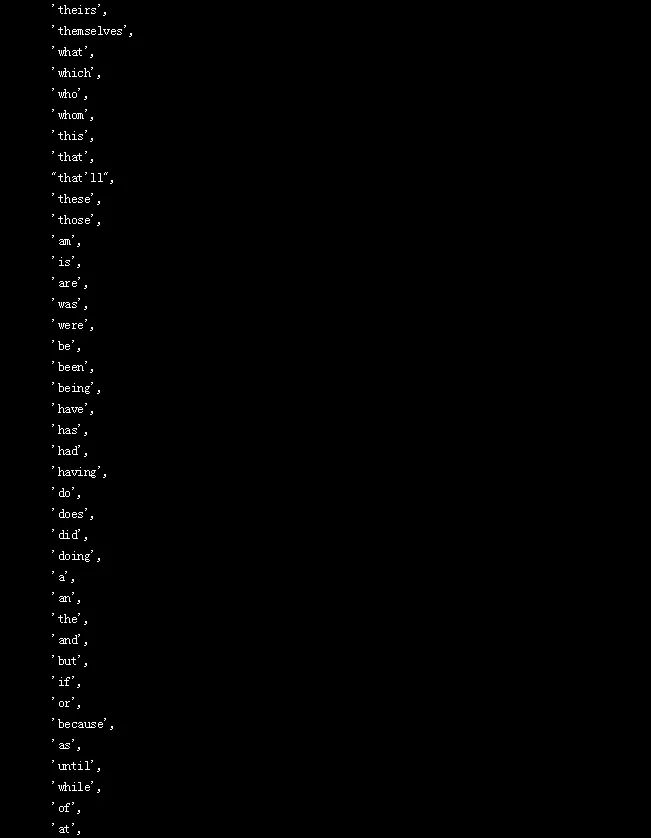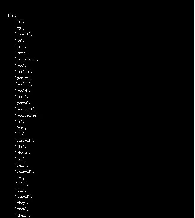 记得我们在这个项目开始的地方从nltk.corpus导入了stopwords模块,所以现在我们来看看什么单词包含在这个预先制作的stopwords列表中: