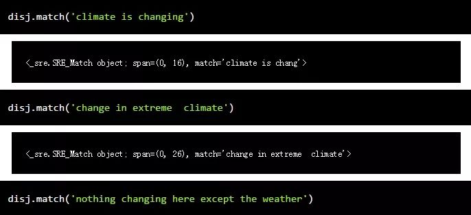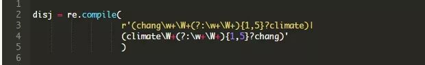 我们可以使用 | 来表示逻辑or,所以我们也可以在1到5个单词之内匹配到后面跟着chang字符串的climate字符串。1到5个单词的部分是正则表达式的一部分,它看起来像这样:(?:\w+\ W+){1,5}?。