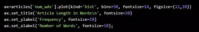 在这一点上,它可能有助于我们可视化文章字数的分布,以了解我们的离群值对平均值的影响有多大。让我们生成另一个图表来看看:
