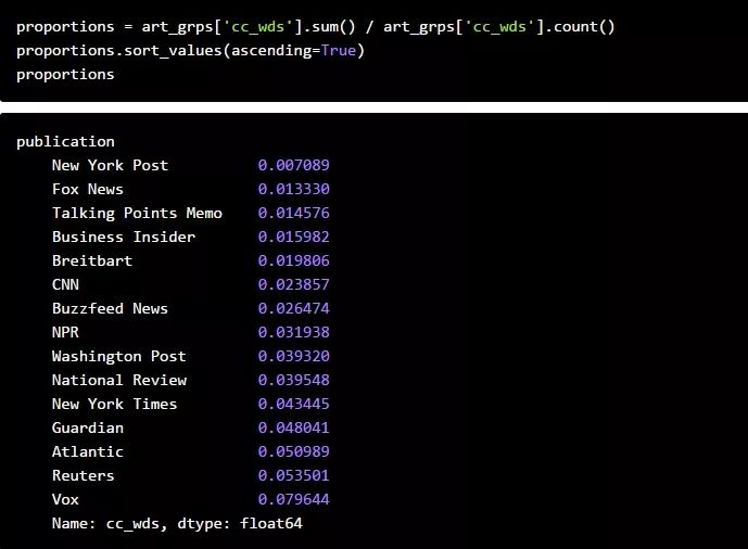 现在,让我们将表中数据分解成比例,并对列表进行排序,这样我们就可以快速地看到哪些媒体对气候变化的报道最多: