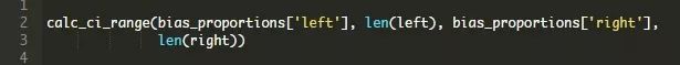 查看“左”相对于“右”出版物的比例差异,可以看到,我们的置信区间在1.8%到2.1%之间。这是一个相当窄的范围,并且相对于总体比例差异范围来说,也远远地远离零。拒绝零假设是显而易见的。同样,center对left的范围是1.3%到2.1%: