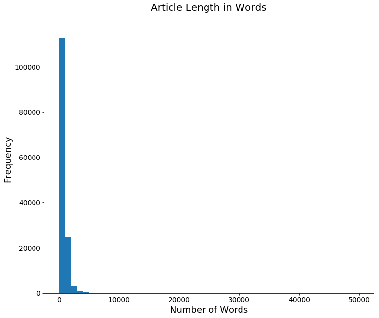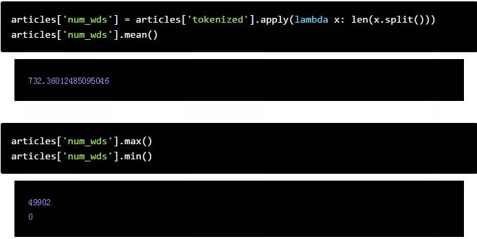 我们来看看每篇文章的平均(平均值)字数,以及我们数据集中最长和最短的文章。