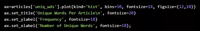 我们的Python文本分析的下一步是:探究文章的多样性。我们将以每篇文章中独特字的数量作为开始。要计算这个值,我们需要创建一个文章中单词的集合,而不是列表。我们可以将这个集合看作有点像列表,但是集合会省略重复的条目。