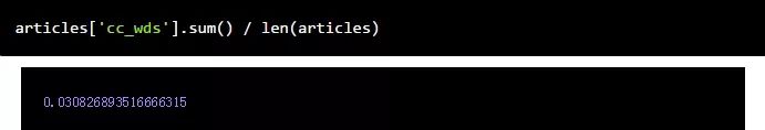 我们需要做的是计算气候相关文章的相对比例。我们可以在布尔字段(如cc_wds)上使用sum函数来计算True值的数量,并用它除以已发表文章的总数以得到我们的比例。