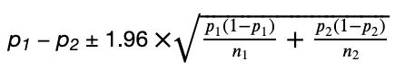 为了计算该置信区间,我们需要一个点估计和一个误差范围; 后者由临界值乘以标准误差组成。对于比例差异,我们对它的点估计值是p 1- p2,其中p1和p2是我们的两个样本比例。在95% 的CI下,临界值是1.96。接下来,我们的标准误差是:
