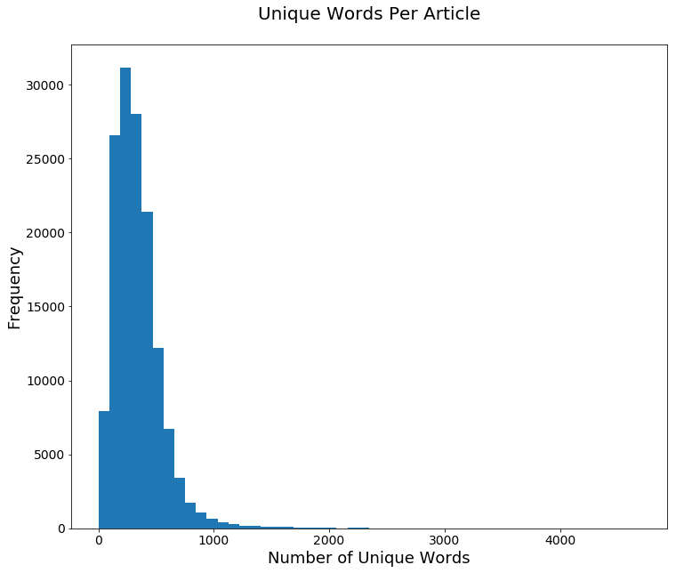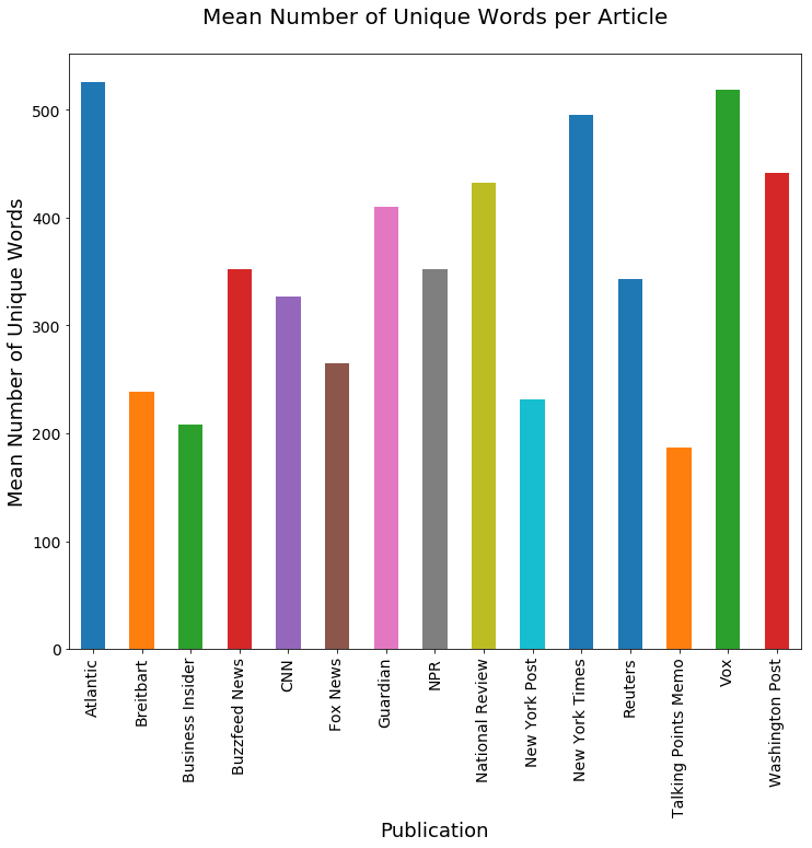 我们想要按单词来检查平均文章长度,但同样重要的是这些单词的多样性。我们来看看两者。
