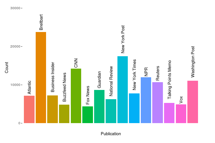 在这篇文章中,我们将使用Andrew Thompson提供的来自Kaggle的新闻数据集(没有关联)。该数据集包含超过14.2万篇文章,来自15个来源,大部分来自2016年和2017年,并被分成三个不同的csv文件。以下是Andrew在Kaggle 概览页面上展示的文章数量: