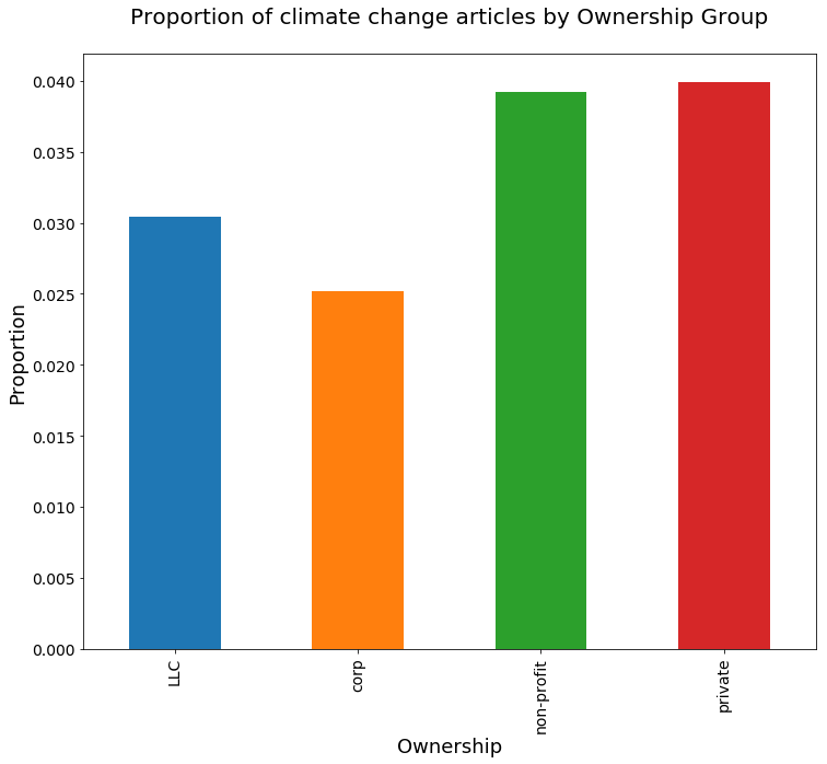 我们发现了一些有趣的差异,这些差异是统计显著性的,包括右倾新闻来源对气候变化的报道更少,有限公司和有限责任公司对气候变化的报道比非盈利媒体和私人媒体更少。